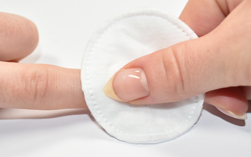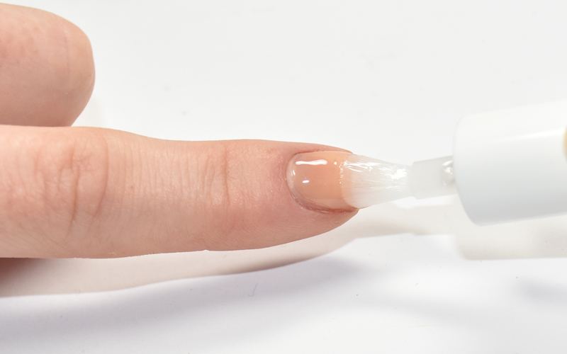 Genom att hålla penseln några centimeter ovanför nageln och lätt stöta i borsten så faller det lösa glittret ner på nageln. Försök att få det på halva nageln. Detta måste du göra innan lacket har torkat för att glittret ska fästa på nageln.