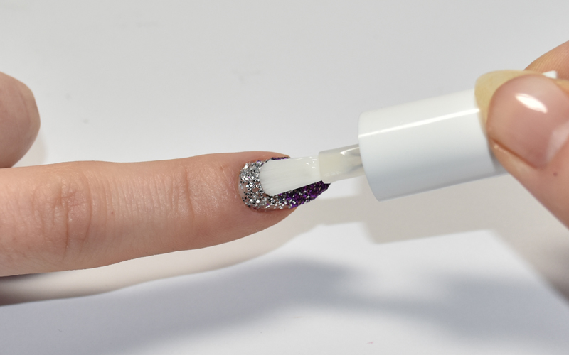 När du är nöjd använder du fjäderborsten för att borsta bort det överflödiga glittret som ligger runt nageln.