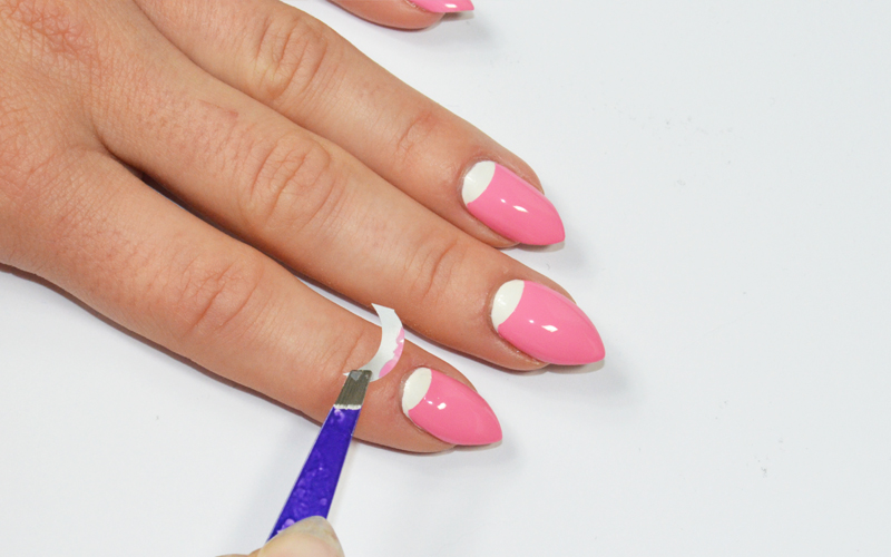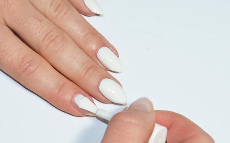 När lacket är helt torrt applicerar du mallar, som du finner i kittet med Stripe nr:6654, mot nedre delen av nageln.