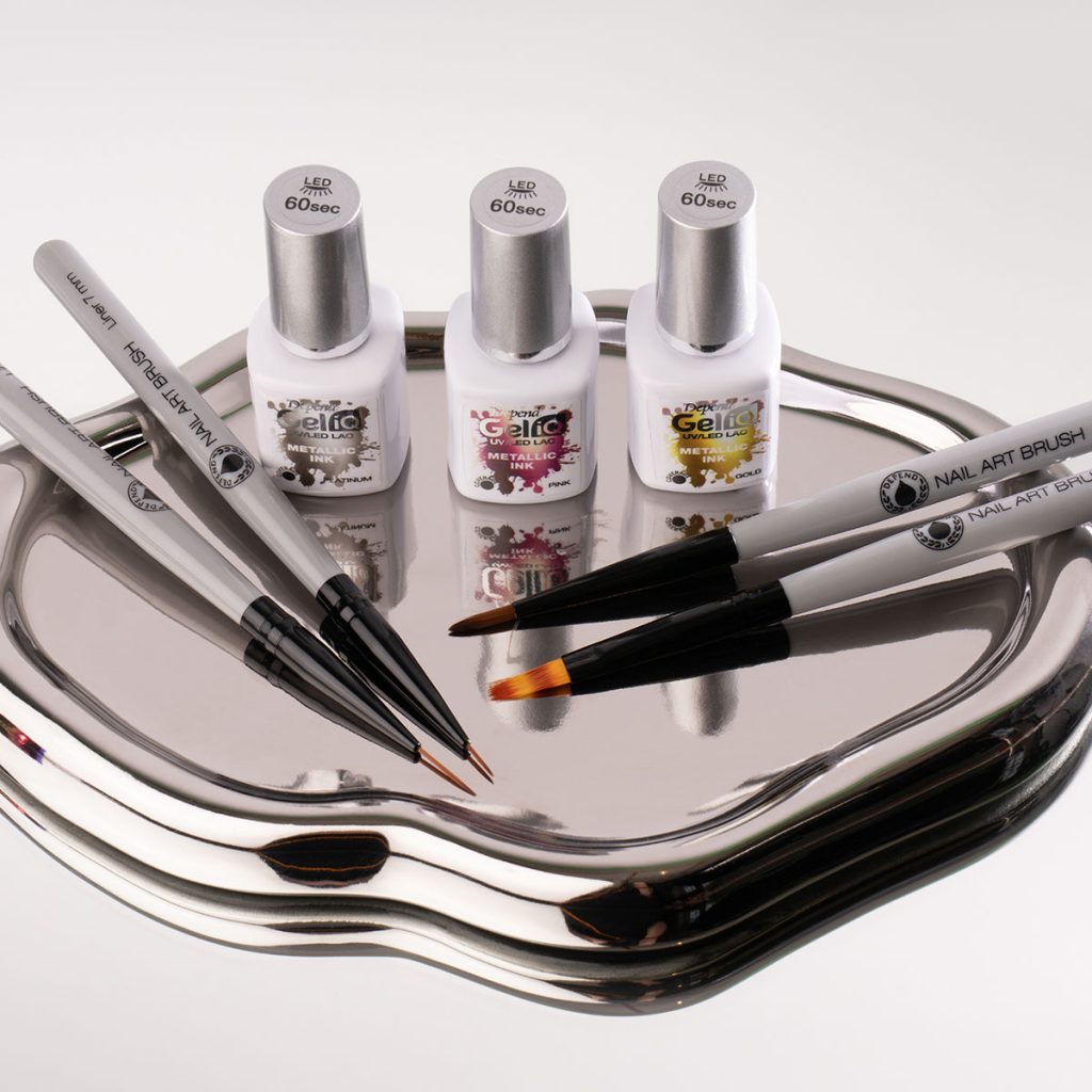 Metallic Ink är baserat på en lufttorkande vätska med unika metalliska pigment. Du kan skapa en cool smokey-effekt med hjälp av en Nail Art-pensel och Pre-Cleanser, men var snabb innan Metallic Ink torkar. Metallic Ink är lika snygg på hela nageln som i kreativa detaljer. Skaka flaskan noggrant och applicera på torr yta. Använd lacket som det är, lek med olika nyanser i lager eller skapa unika effekter på delar av nageln. Avsluta med Gel iQ Top Coat. Nyanserna har hög täckningsgrad så en till två appliceringar räcker.