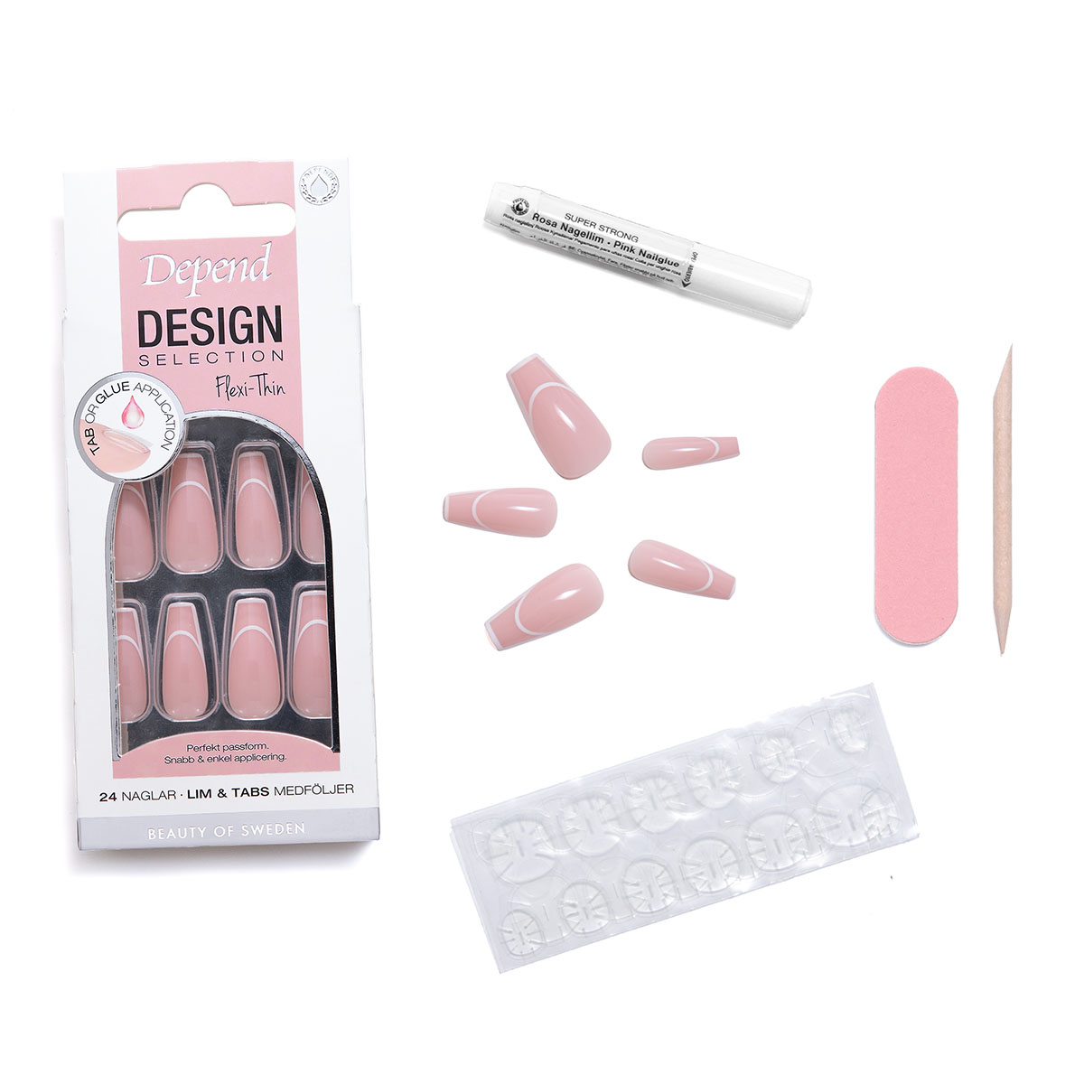 Innehåller: 24 st naglar, 1 st fil, 2 g lim, 24 st tabs (dubbelhäftande nageltejp), 1 st manikyrpinne.