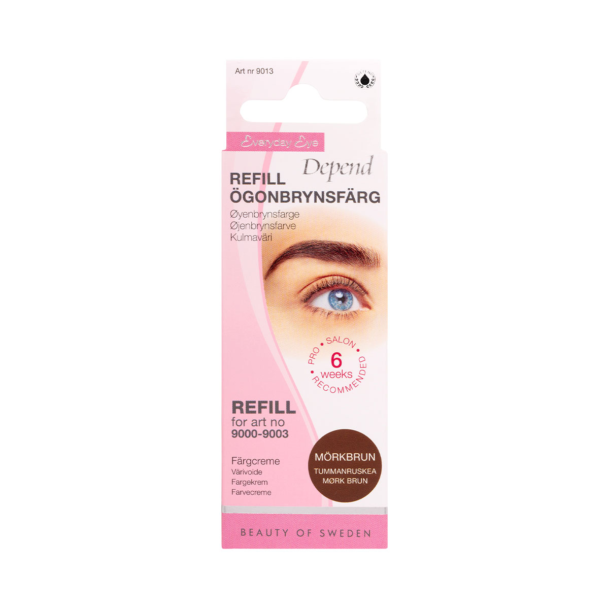 Har du använt Depend Everyday Eye Ögonbrynsfärg art nr 9000-9003 och har väteperoxid kvar men slut på färgcremen? Då är denna refillförpackning perfekt som innehåller färgcreme och applikatorborste. Ögonbrynsfärgen ger dig naturligt markerade och fylliga bryn på bara några minuter, en permanent färgning som håller i upp till 6 veckor. Finns i färgerna svart, brunsvart, mörkbrun och brun.